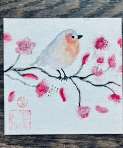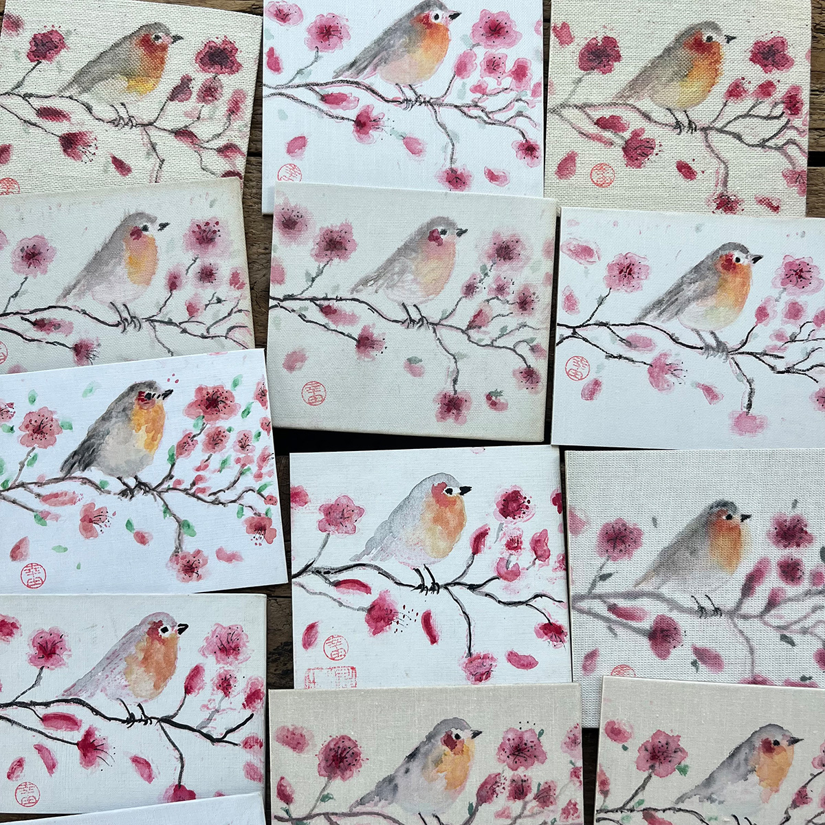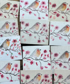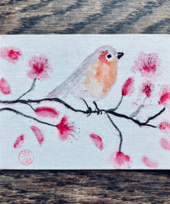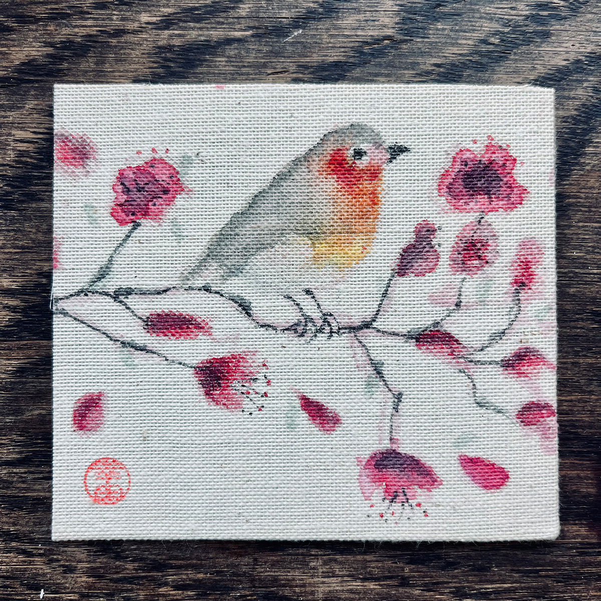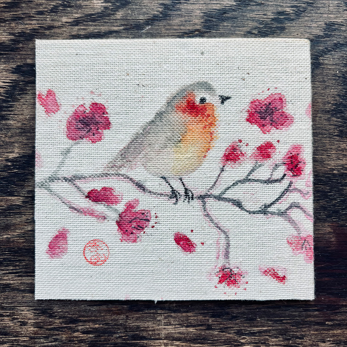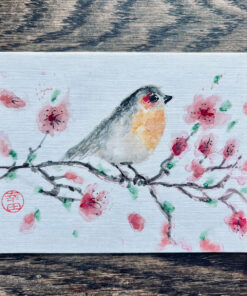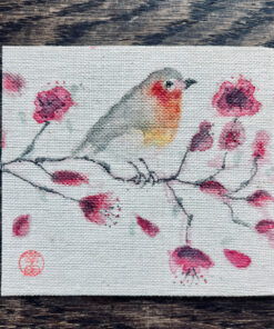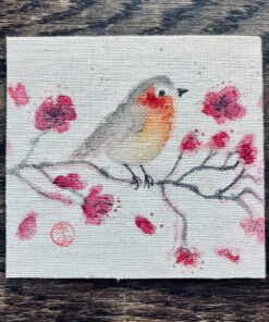 hier wurde ein h Rotkehlchen mit Kirschblütenzweig auf einen recyelten Buchdeckel aquarelliert.