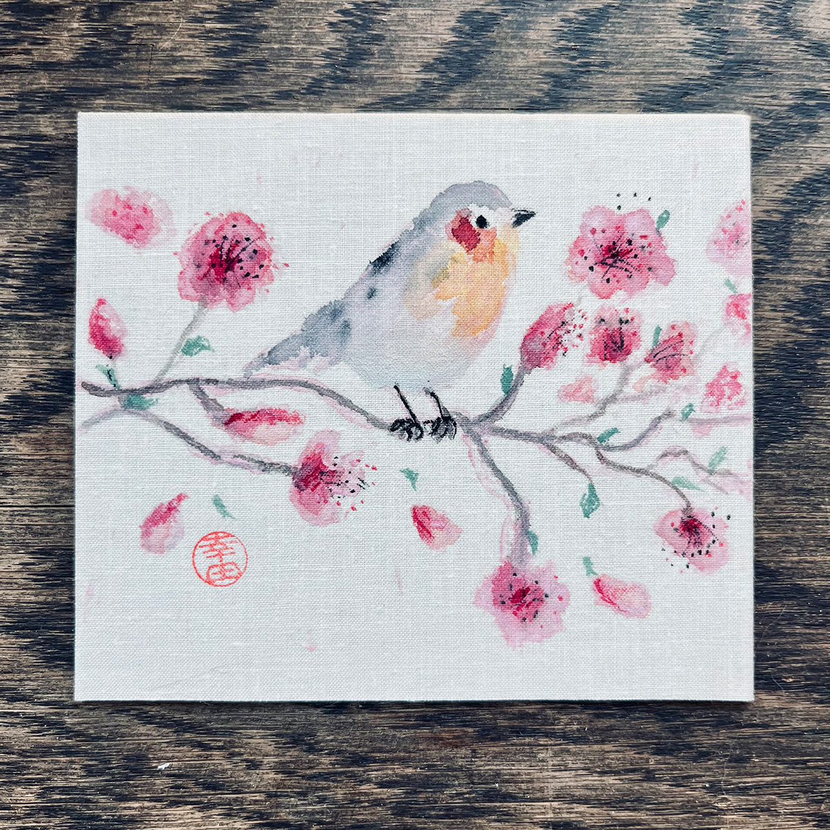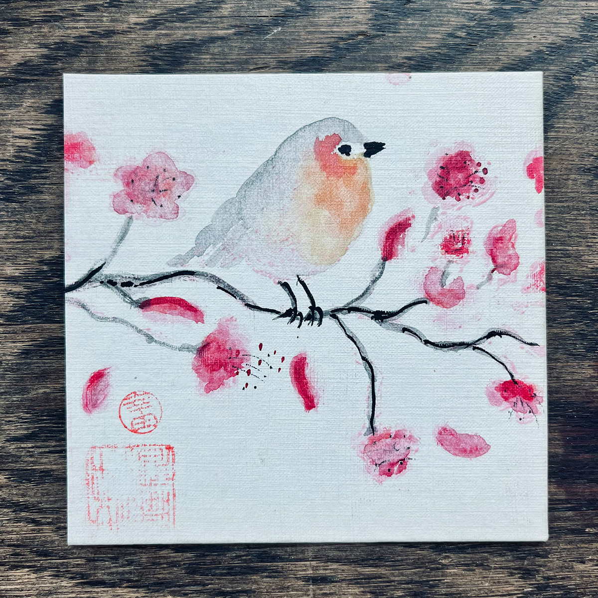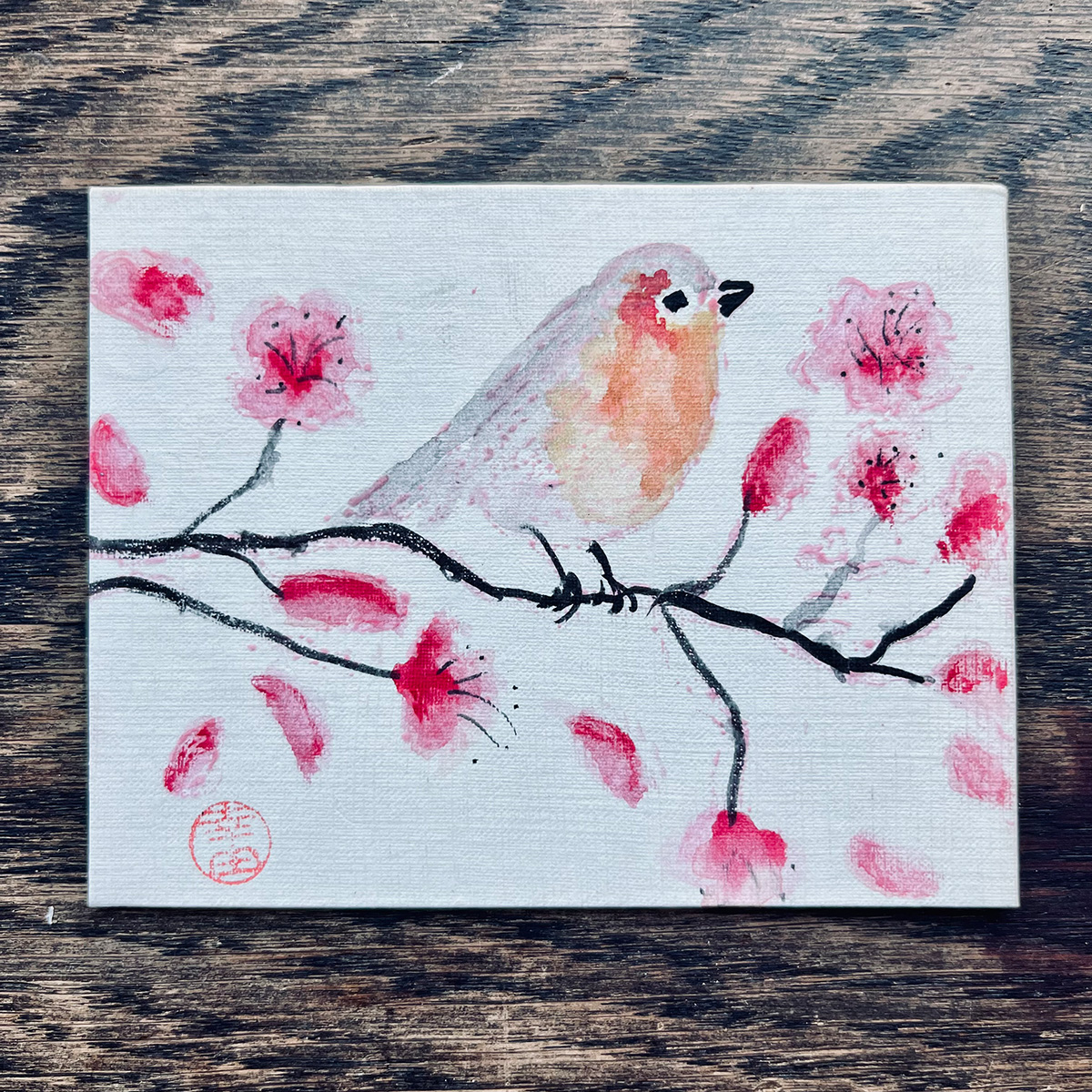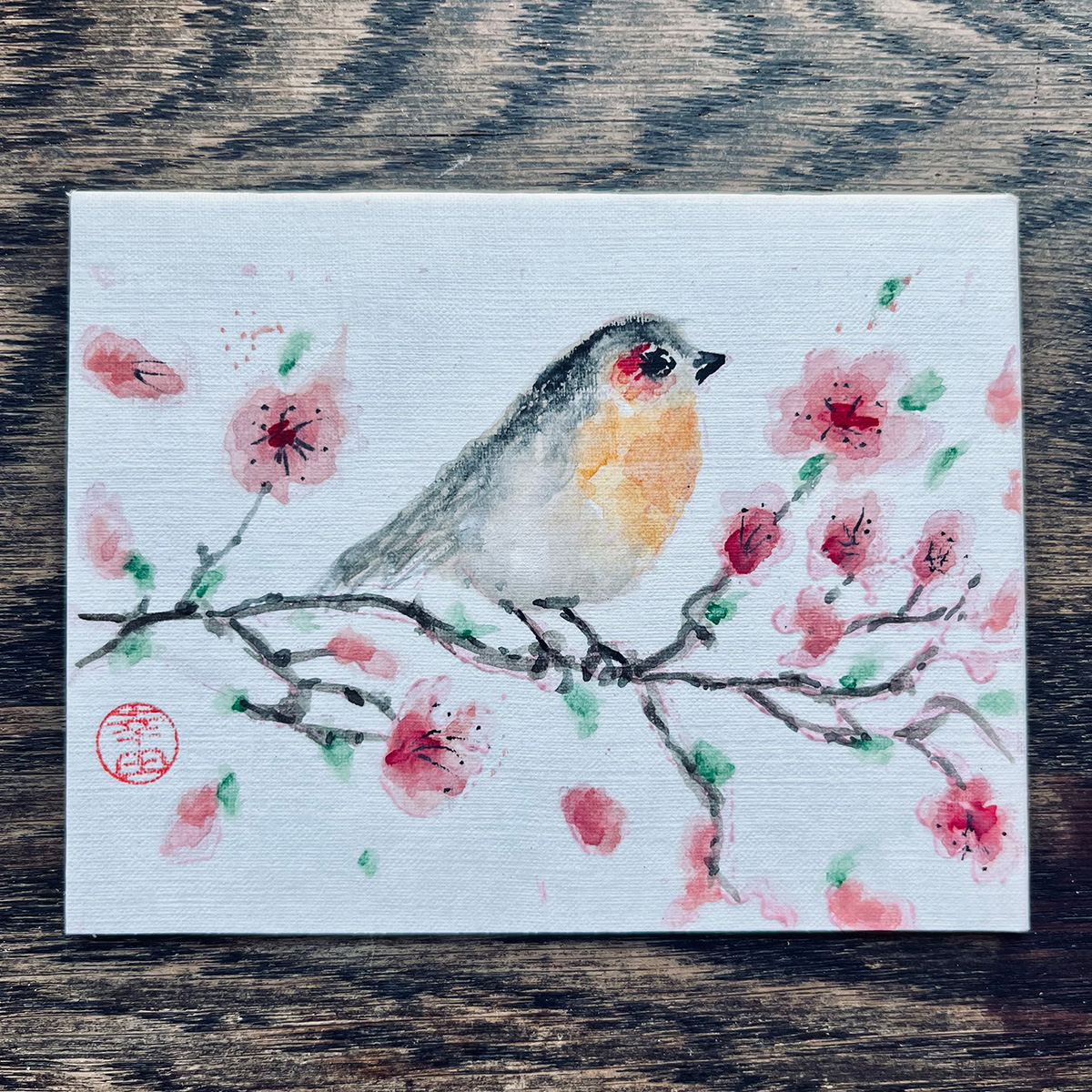 hier wurde ein h Rotkehlchen mit Kirschblütenzweig auf einen recyelten Buchdeckel aquarelliert.