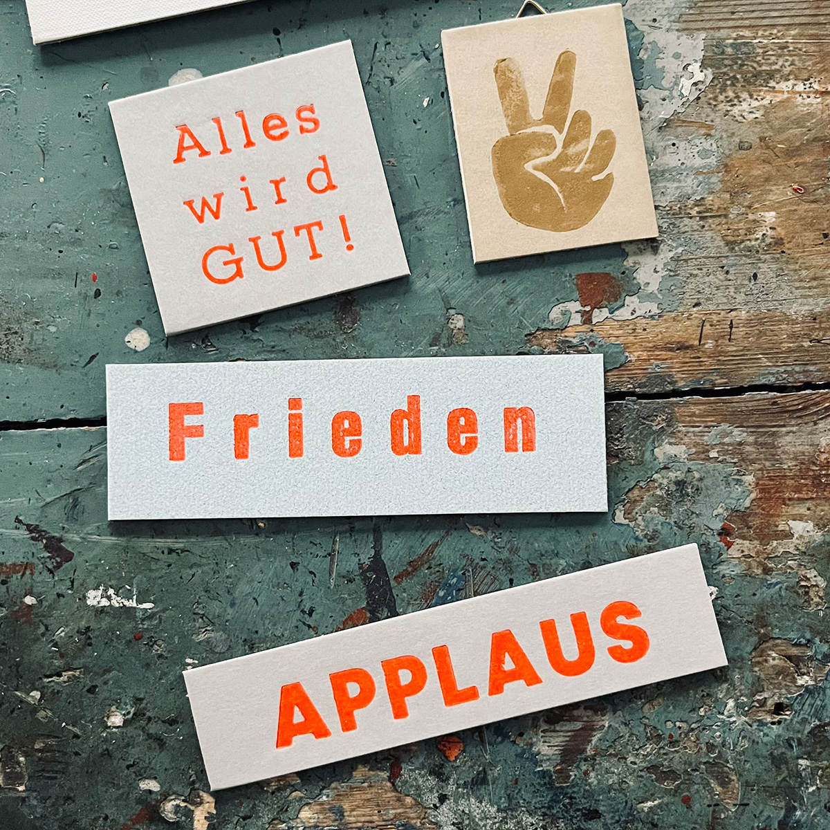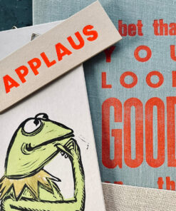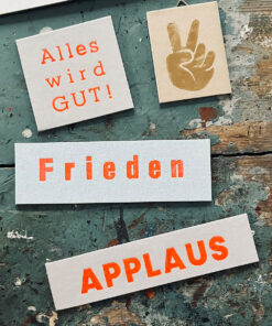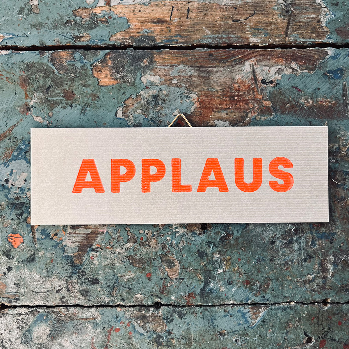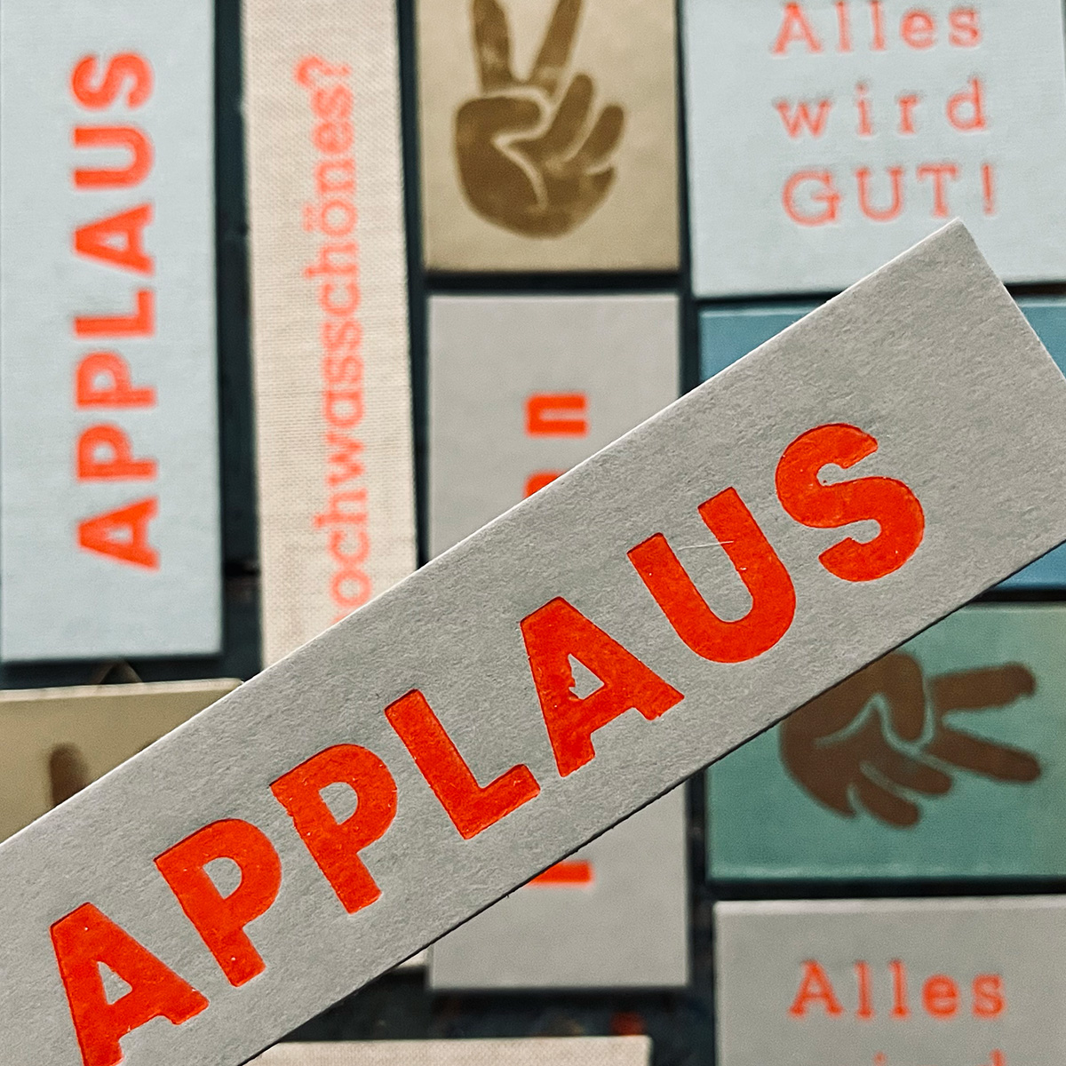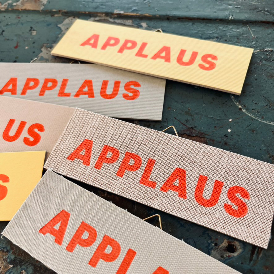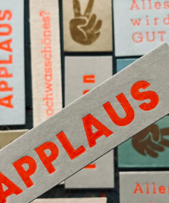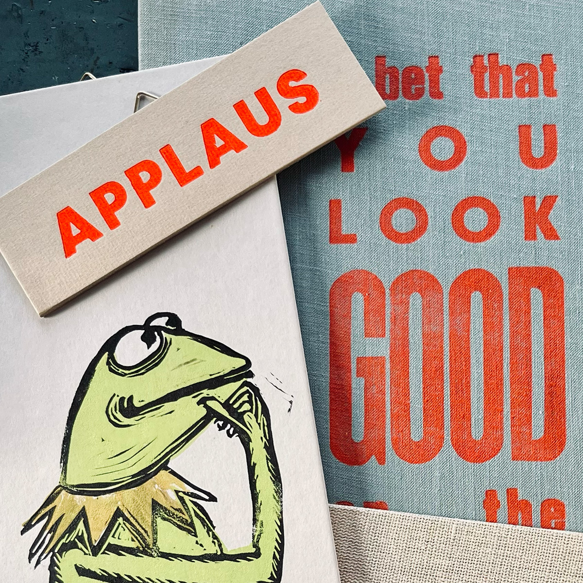 Hier wurden Bleilettern auf einen recycelten Buchdeckel mit neon Buchdruckfarbe von Hand gedruckt