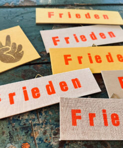 Hier wurden Bleilettern auf einen recycelten Buchdeckel mit Buchdruckfarbe von Hand gedruckt