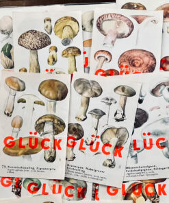 auf Vintage-Unikaten ‚das große buch der pilze‘, aus den 1960ern mit neon roter Buchdruckfarbe von Hand gedruckt.