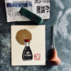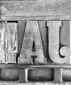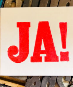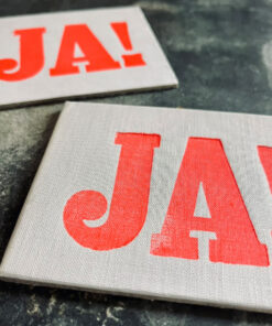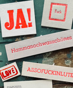 Hier wurden Plakatlettern aus Holz auf einen recycelten Buchdeckel mit NEON Buchdruckfarbe von Hand gedruckt