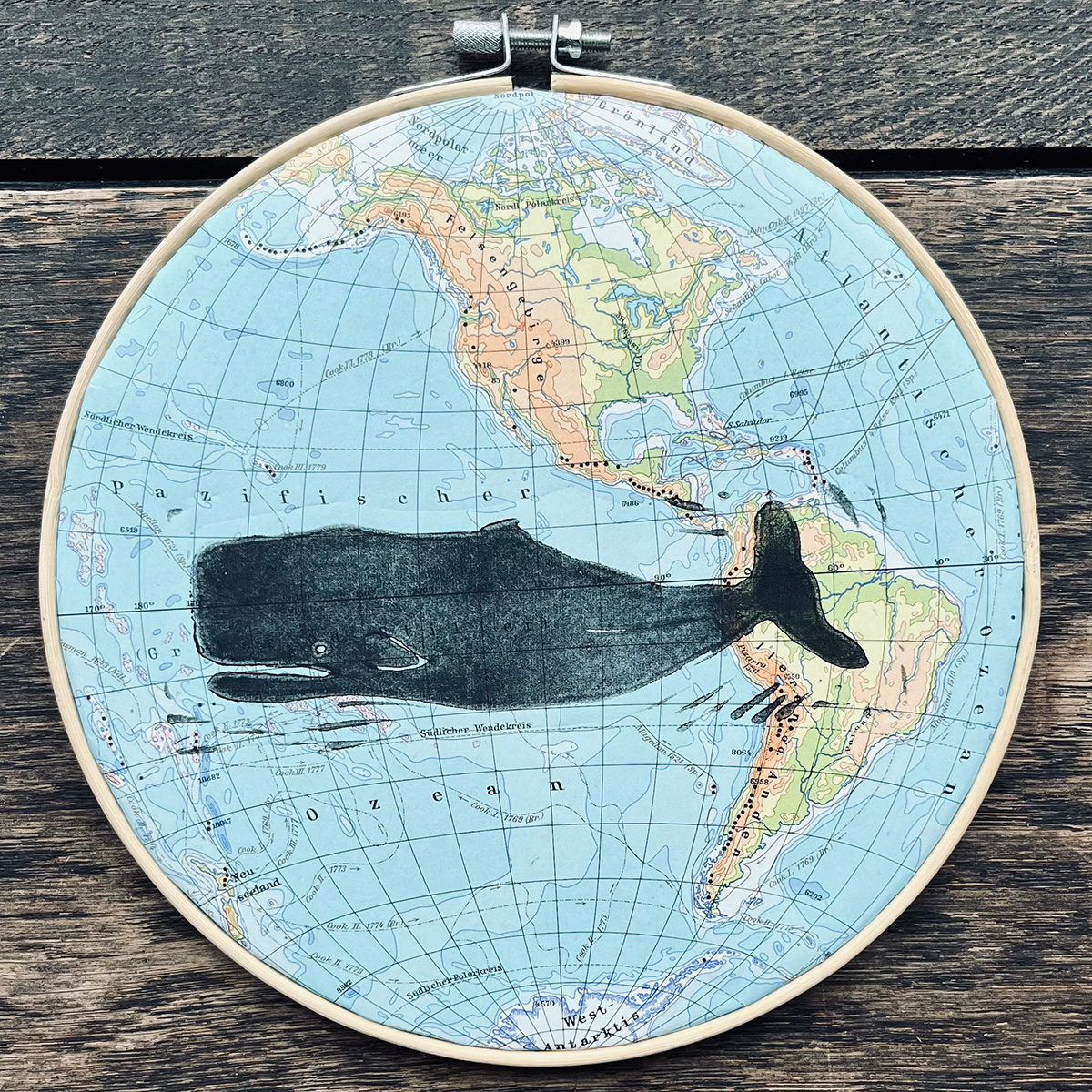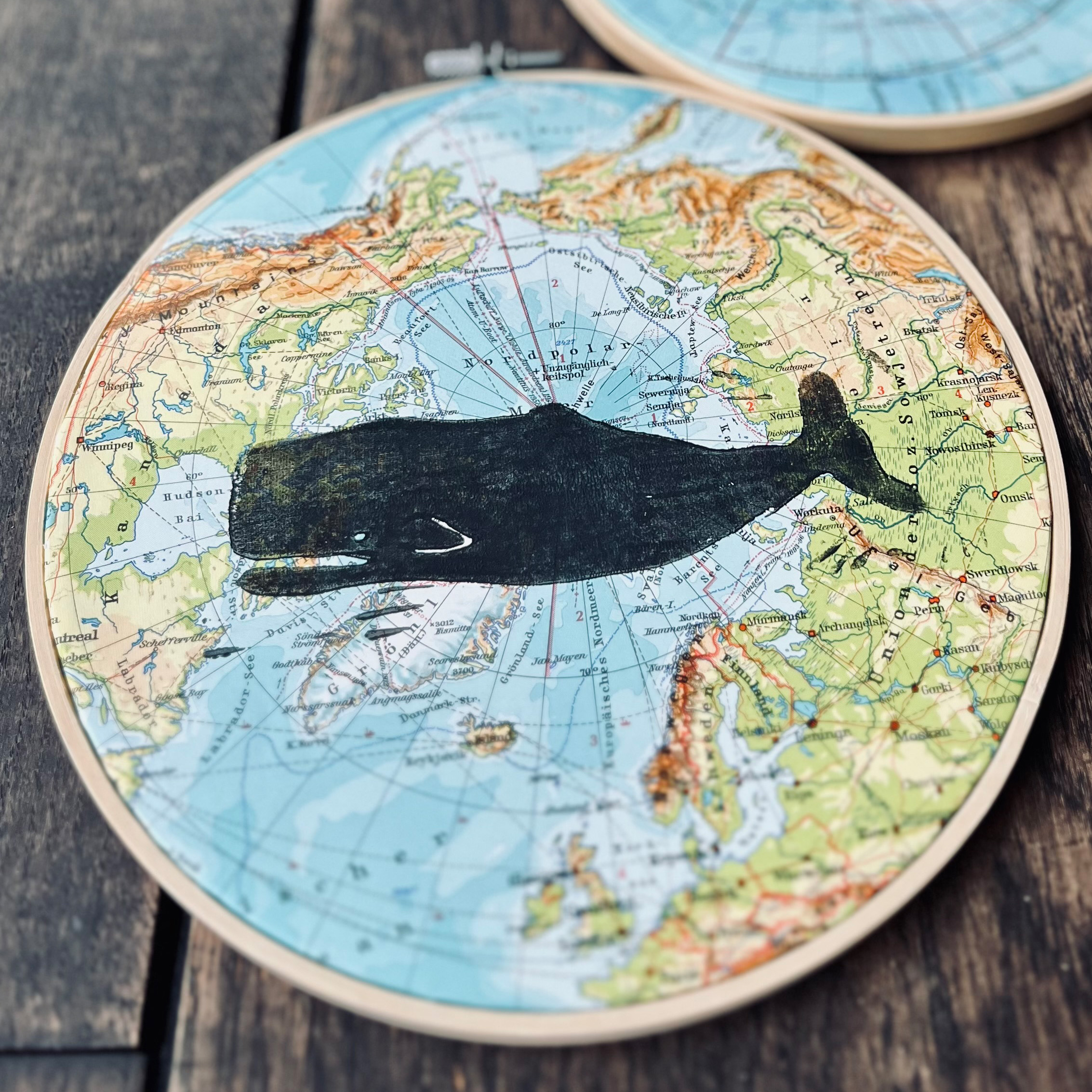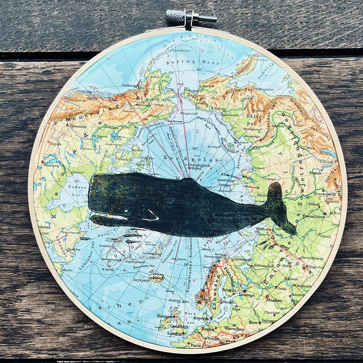 Hier wurde ein handgeschnitzter Linolschnitt auf ein vintage Atlantenblatt Amerika oder Nordpolarkreis mit Linolfarbe von Hand gedruckt.