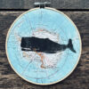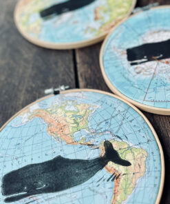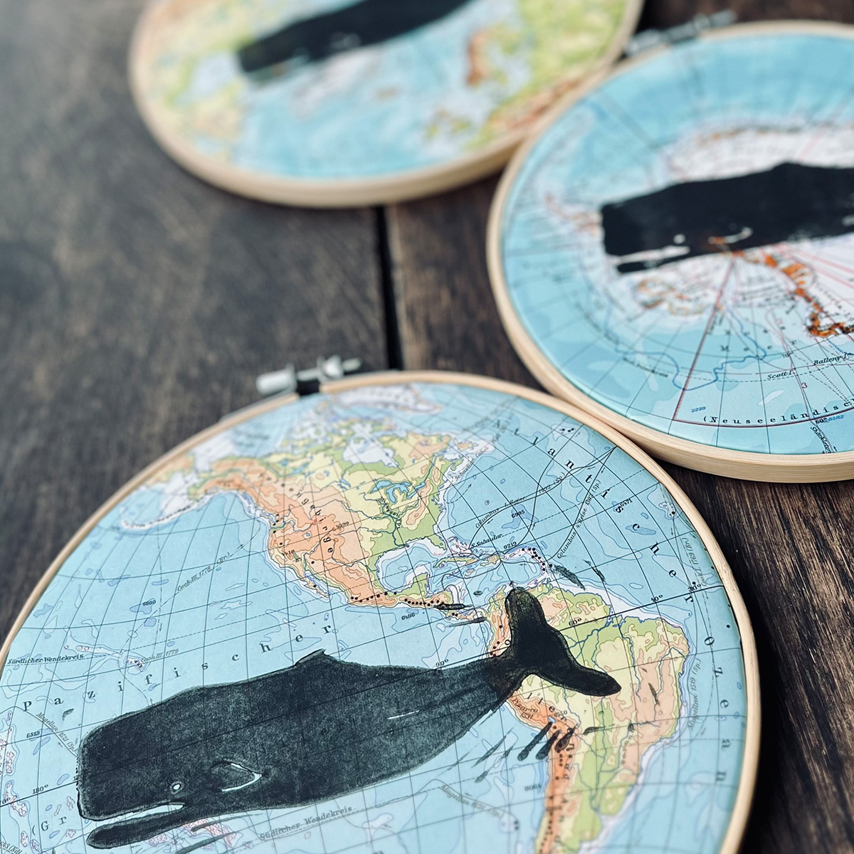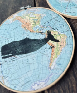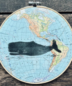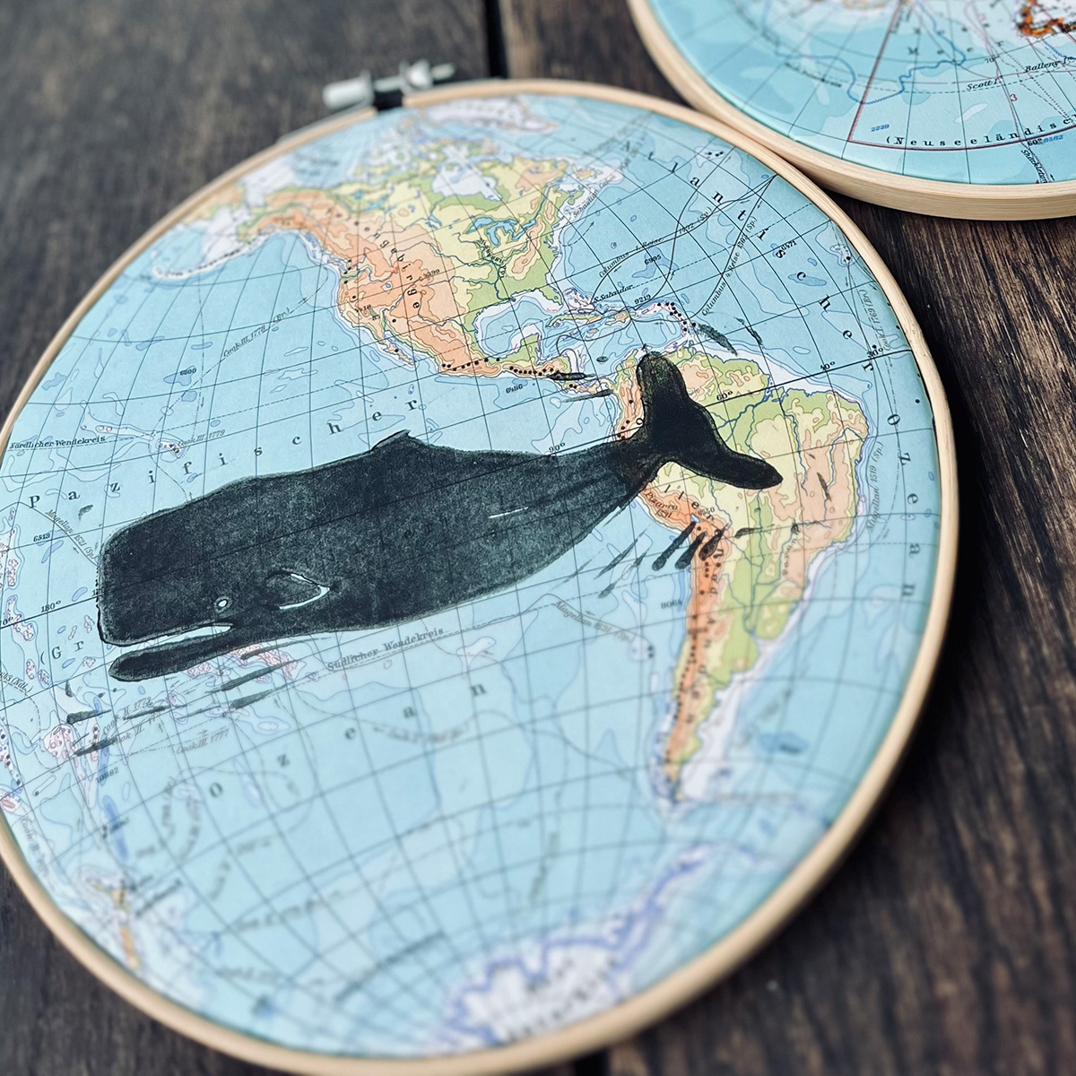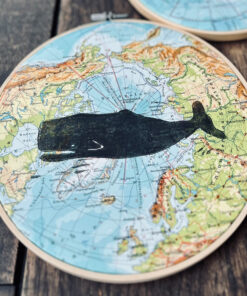 Hier wurde ein handgeschnitzter Linolschnitt auf ein vintage Atlantenblatt Amerika oder Nordpolarkreis mit Linolfarbe von Hand gedruckt.