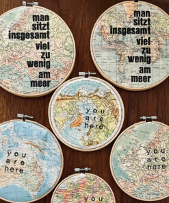 Buchdruckfarbe, Bleilettern, Atlaspapier, Stickrahmen